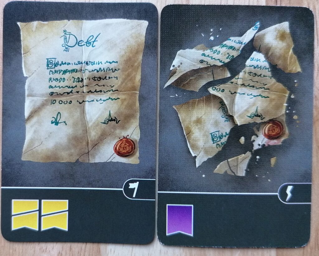 The main ways to gain a debt card in Architects of the West Kingdom are to drop below zero on the virtue track and to have the most workers in prison during a ‘black market reset’. The prison aspect is, for me, the most interesting part of this game. When I said earlier that some of your workers may start on the board, this is where they start. Throughout the game, players will have opportunities to take an action to ‘arrest’ a group of workers from one or more spots on the board. If they ‘arrest’ their own workers, they just take them back into their player area, but if it’s an opponent’s workers, then they keep them in a separate area of their player board, until they take them to prison, trading them in for one coin per worker. Black market resets happen when either all three spaces at the black market have been taken, or when you get to a certain point in the game. There will be, at the very least, two of these in the game, and they can sometimes sneak up on you, so you’ll need to be aware of them. A debt card, at first, will be worth minus two points each at the end of the game. However, you can pay them off, flipping them over to make them worth plus one point instead, and though it usually costs quite a lot to do this, it could be part of your strategy.