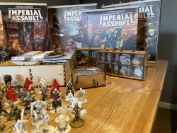 Here is a gallery with my entire collection on my dining table that is too small to play a lot of games on however, there is no way I have the space to get Imperial Assault on the table, with all minis, tiles, tokens and campaign guides easily available.